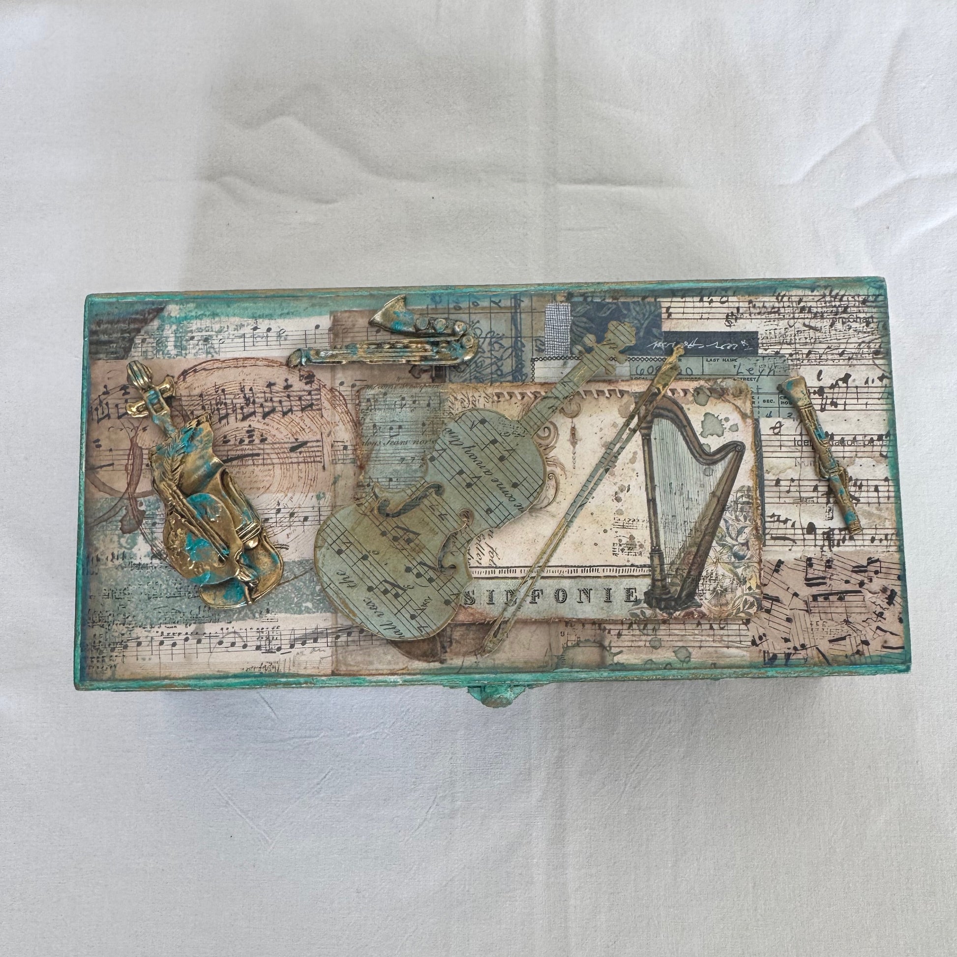 Ce coffret artisanal fait main rend hommage à l’univers de la musique avec ses instruments en relief et ses nuances de bleu et beige patinées. Réalisé en mixed media (papiers, textures, patines), il séduit par son style vintage et poétique.