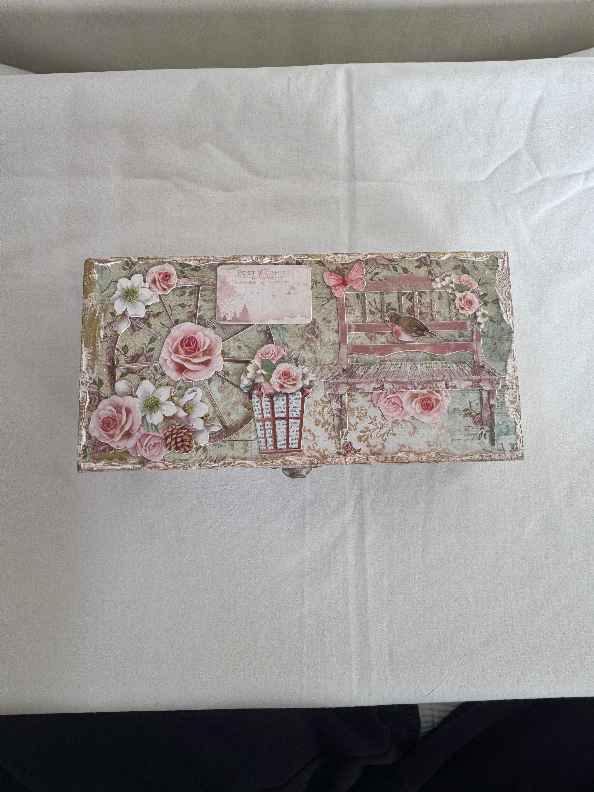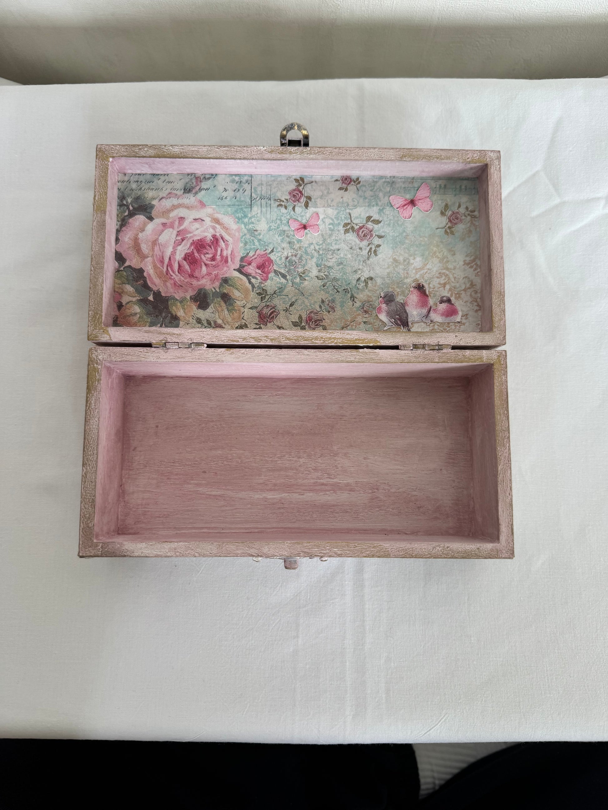 Ce coffret fait main évoque la douceur et la nostalgie du romantisme à travers ses motifs de roses, papillons et textures pastel. Réalisé selon la technique du mixed media, il associe papiers décoratifs, reliefs et patines douces pour un rendu poétique et élégant.