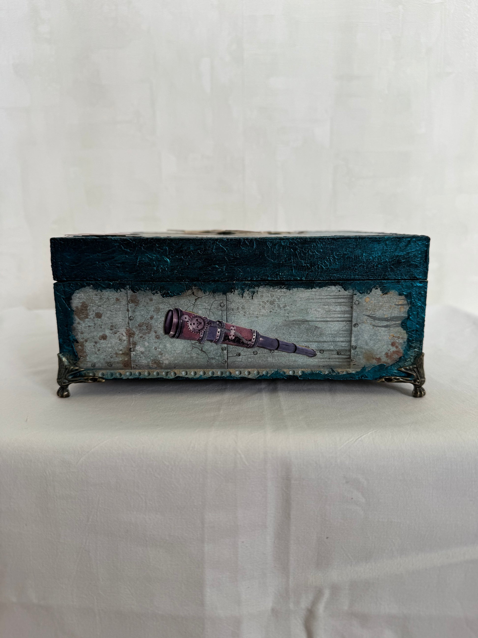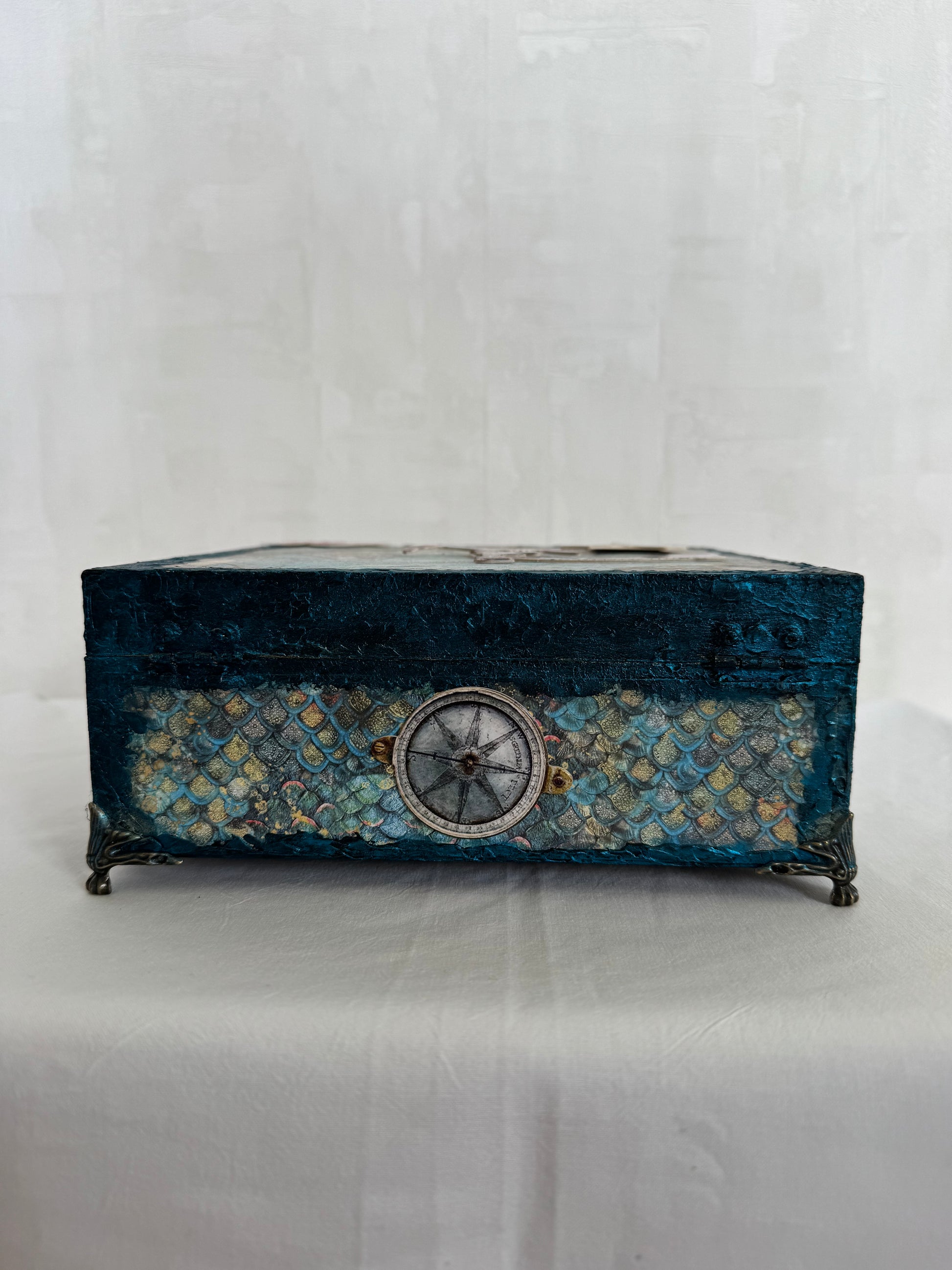 Coffret artisanal unique inspiré de l’océan, réalisé en mixed media avec papiers, résine et patines bleu lagon. Chaque détail rappelle la beauté marine : ancre, coquillages, boussole, étoiles de mer…