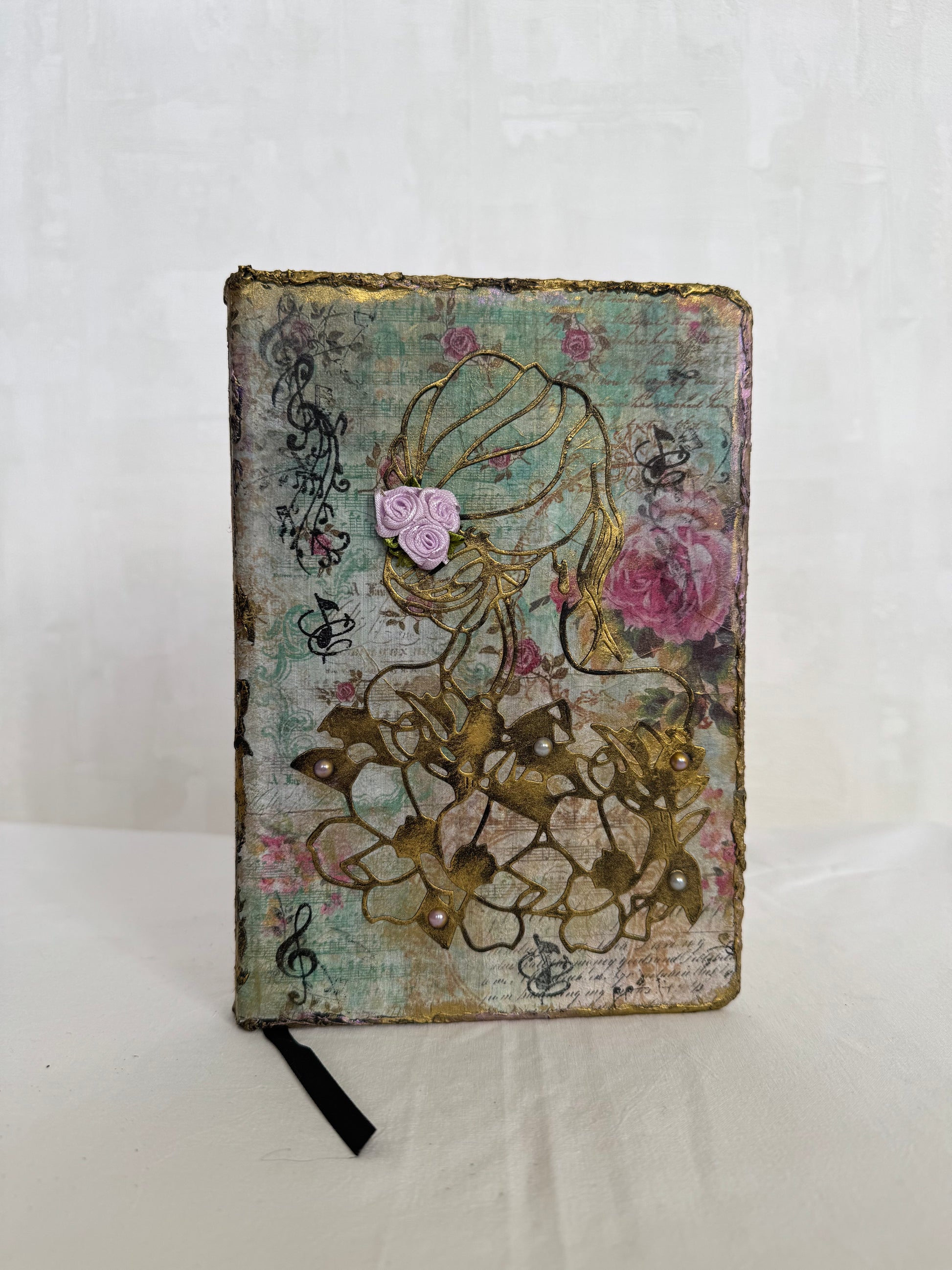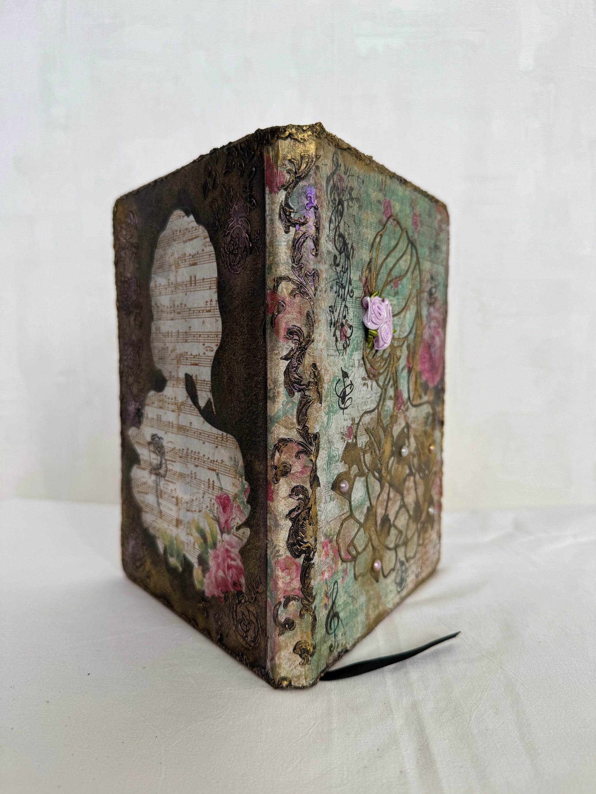 Ce grimoire allie féminité et élégance musicale. Sa couverture texturée révèle une silhouette dorée ornée de perles et de fleurs, sur fond de notes de musique et de roses anciennes.