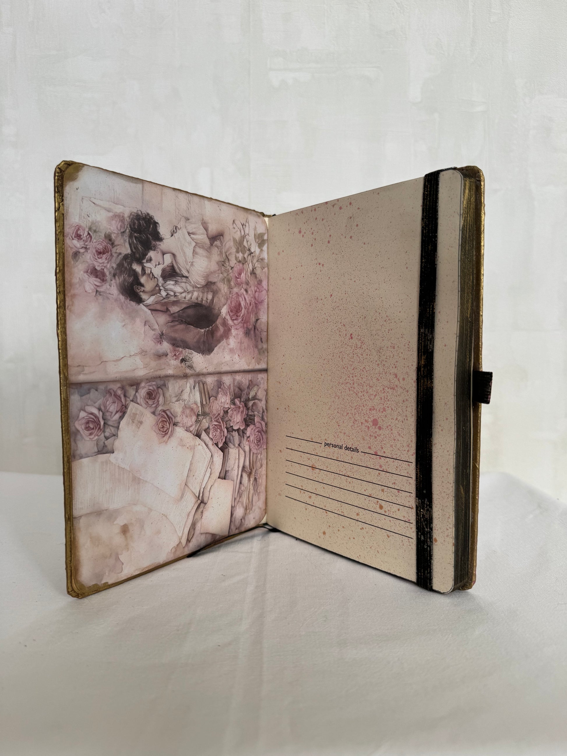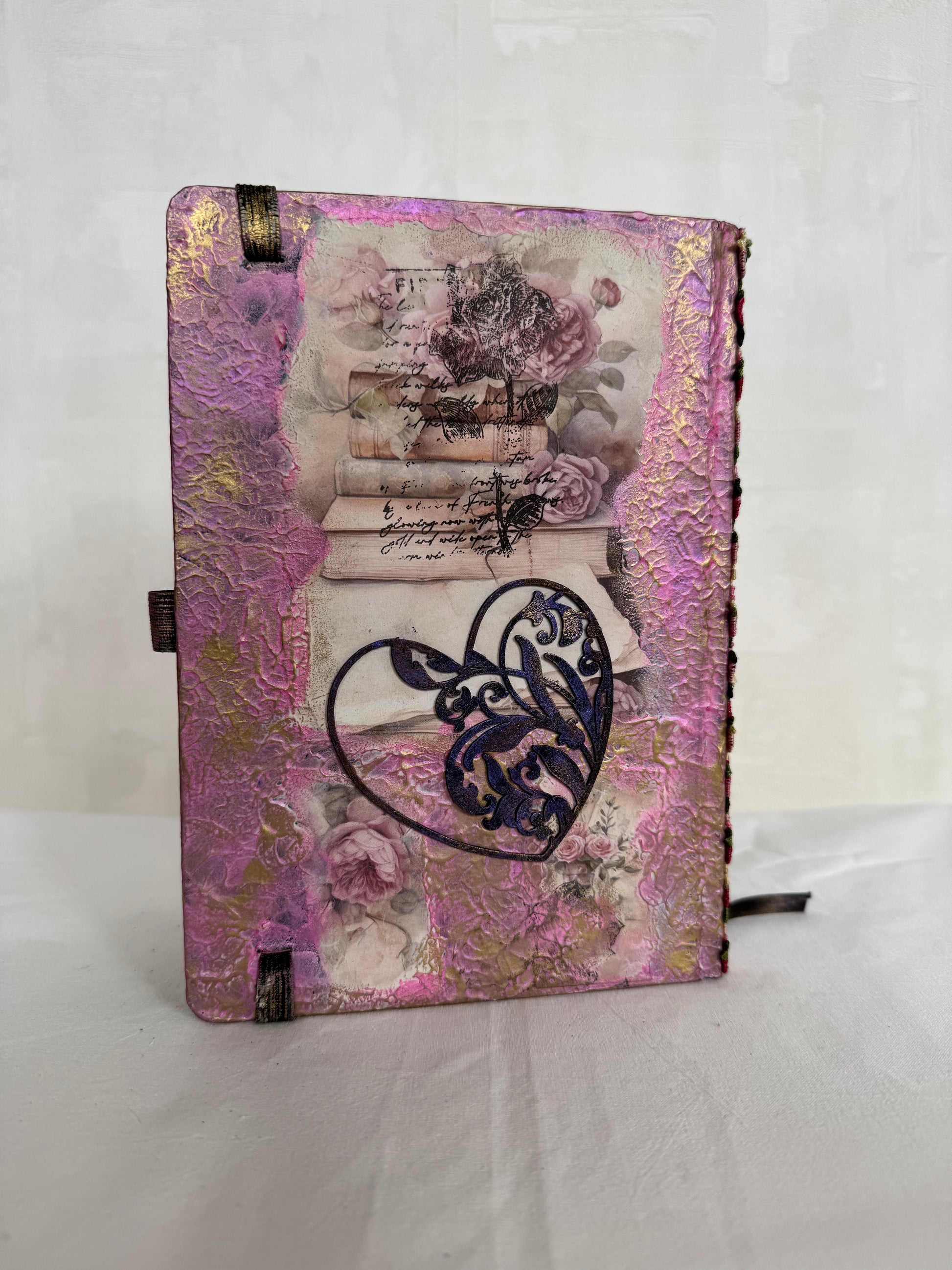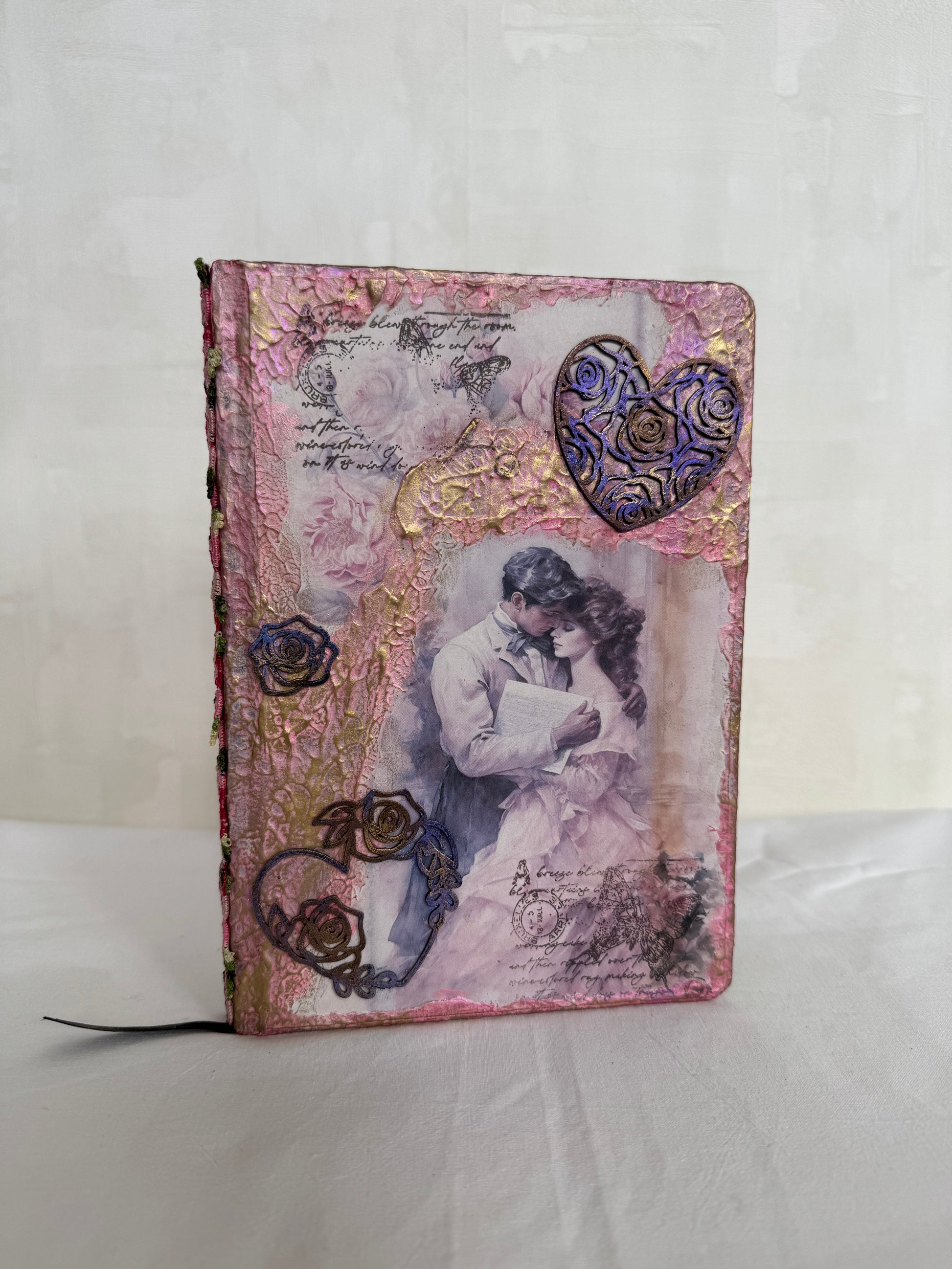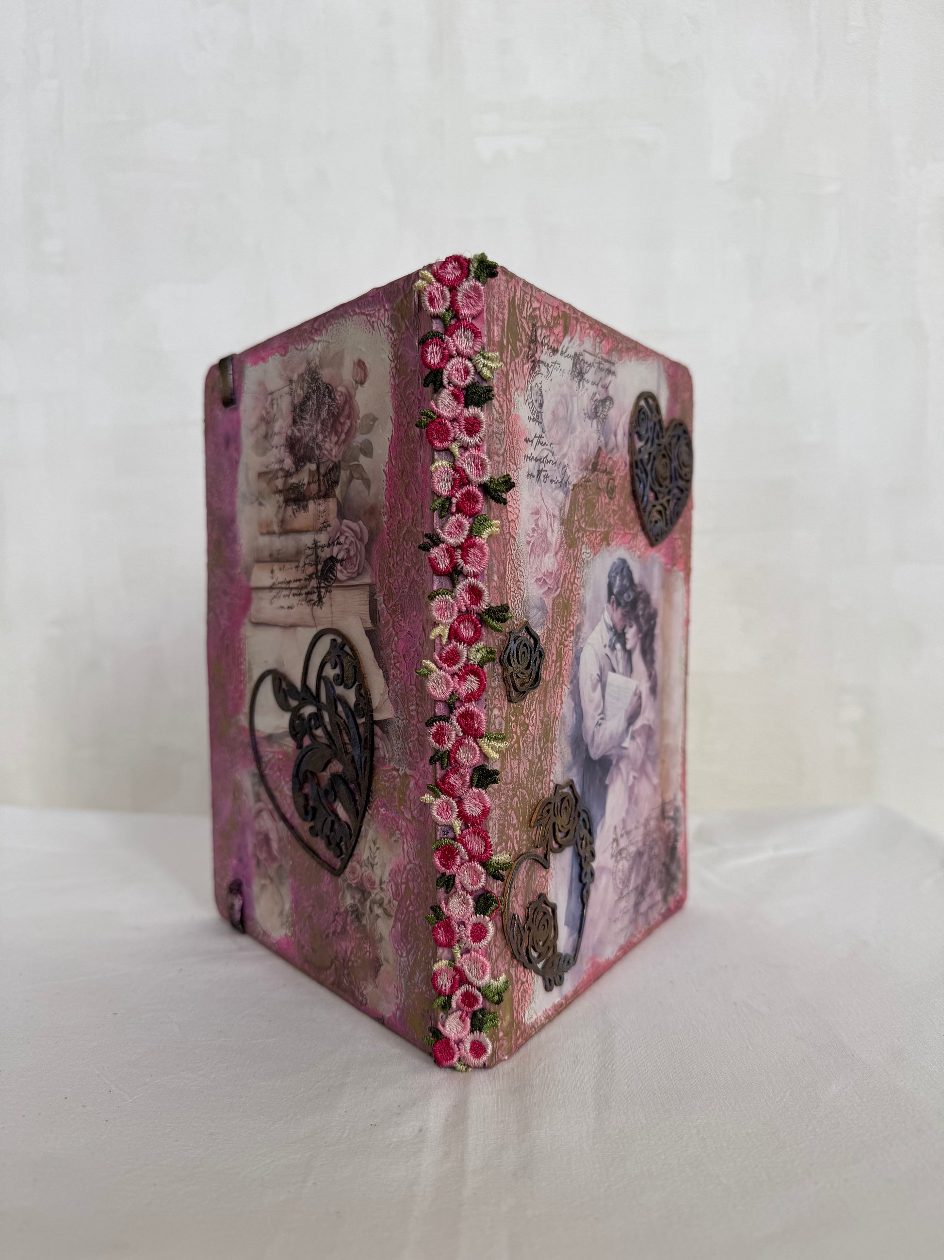Ce grimoire romantique capture toute la tendresse de l’amour à travers ses reliefs, ses cœurs sculptés et ses teintes douces de rose et d’or.
